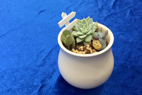 在場有一位特別認真的女士,她大功告成的作品猶如一件精致而特別的工藝品,得知是一位幼兒園教師,平時很喜歡一些小清新風格的手作和美食。今年剛和先生購買了一座泰豐牧馬湖的別墅,希望在入住后把自家的花園裝飾得美美的,要擺滿自己diy的多肉植物,給孩子營造出更有趣味的花園;自己多制作美食,讓家里天天都充滿朝氣和愛。