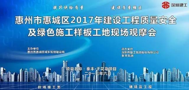6月8日上午,由惠州市惠城區(qū)城鄉(xiāng)規(guī)劃建設局主辦,深圳市泰豐投資集團有限公司、深圳市建工集團股份有限公司承辦的——“惠州市惠城區(qū)2017年建設工程質量安全及綠色施工樣板工地現場觀摩會”,在惠城區(qū)金山湖泰豐·千花島項目舉行。
