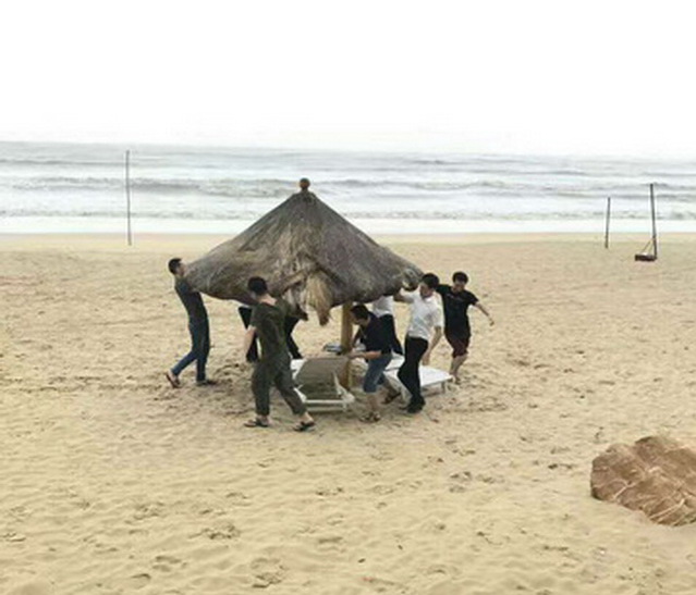 臺(tái)風(fēng)來襲前收起沙灘蘑菇篷