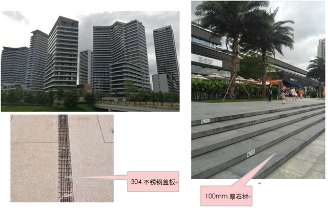 在材料方面,園林中大量使用100mm厚的石材。排水溝蓋板統(tǒng)一使用304不銹鋼,在用材方面較為用心。