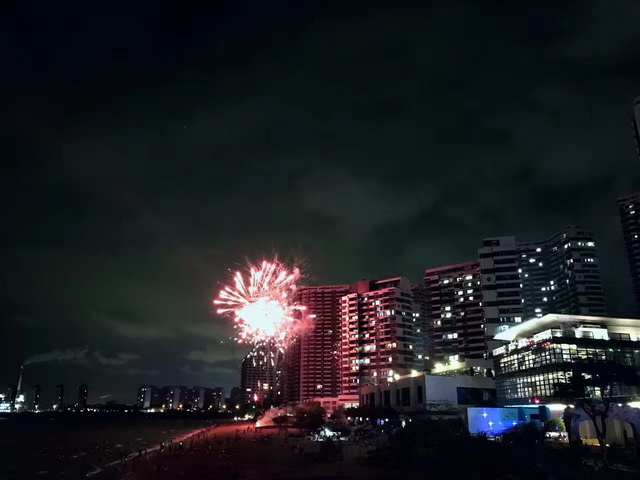在南海邊潔白如銀的泡泡海家園沙灘上,焰火晚會(huì)于晚上八點(diǎn)零八分拉開序幕,各式各樣品種的煙花名如“米蘭之夜”、“銀雨金花”“年年大花”等直沖云霄,偌大的沙灘上人山人海,人們比肩繼踵,爭(zhēng)相目睹這精彩的瞬間。