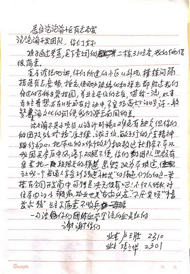 2017年11月9日,泡泡海家園2棟2310業(yè)主專程為服務(wù)中心送來了表揚信,感謝物業(yè)工作人員細致入微、盡心盡責的服務(wù),表達自己對物業(yè)和開發(fā)商的感激之情。